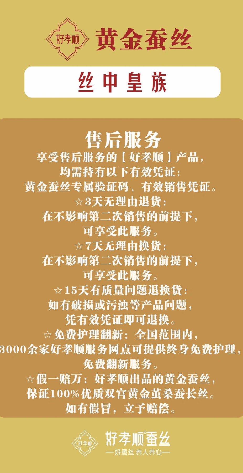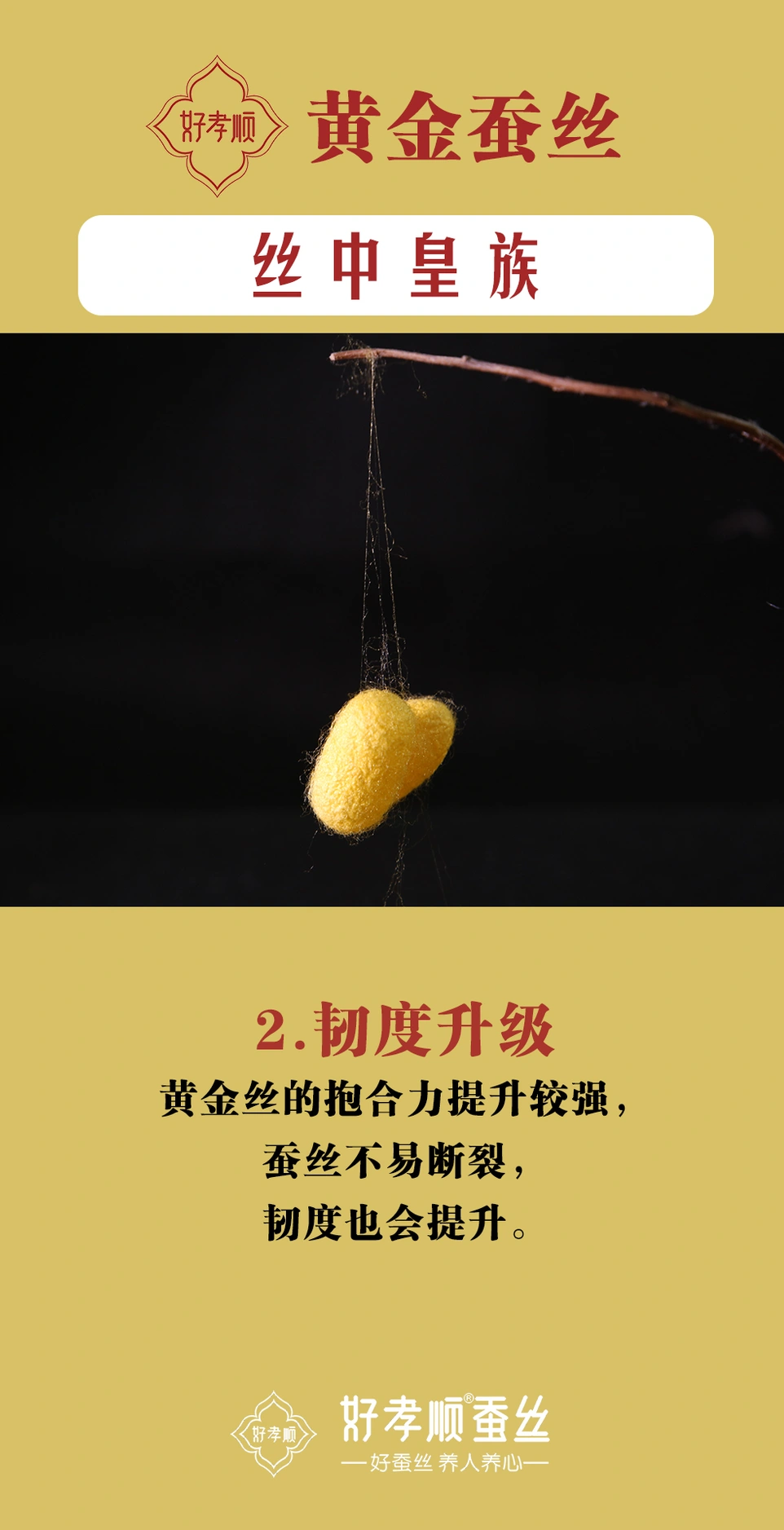 好孝顺黄金蚕丝系列产品选用中越混血优良蚕种--桂蚕H9。甄选100%优质双宫黄金茧桑蚕长丝,丝长达到一千米以上。黄金丝含有胡萝卜素和黄酮素,浑然天成的金黄色泽,不用经过化学染色,更加环保。相比普通蚕茧,黄金蚕丝纤度提升20%细,抱合力(指一根丝牵引力承受的强弱)提升50%,也就是说黄金茧做出来的丝与皮肤接触的时候柔软度提升40%。